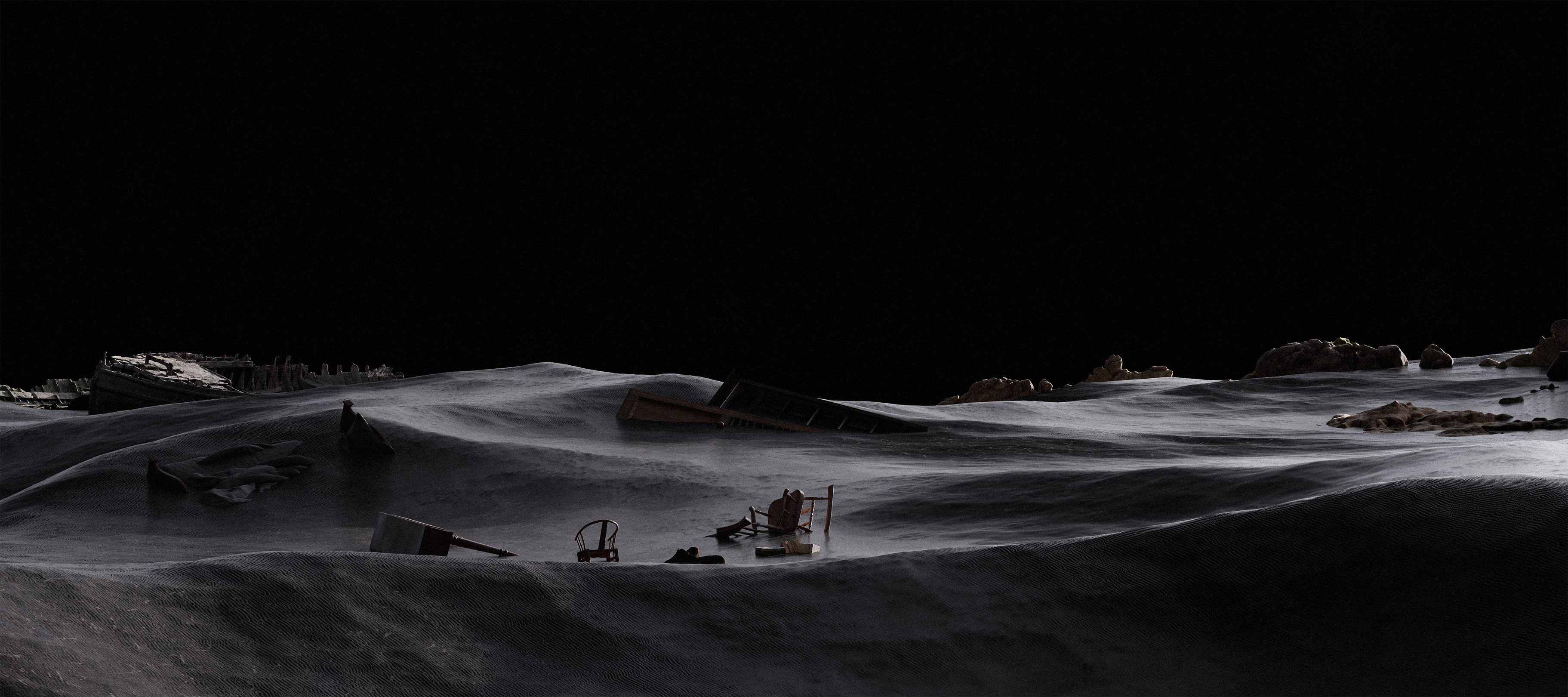 Na Baía da Morte, quatro pessoas deixam as suas vidas. Inspirada em testemunhos reais, a instalação sonora explora o choque entre o mundano da vida e a guerra, o desastre, que interfere com pessoas de diferentes origens, profissões e estatutos sociais. Uma implacável demonstração da máquina da guerra que alude a uma grande onda que esbate a personalidade destas pessoas, destas rochas numa orla, e as torna em grãos — estatística. Esta despersonalização mostra como o areal, consumido pela maré da guerra, tem origem em planos de vida maiores. Mostra como o humano chega à orla e como, à devastadora sombra desse processo, se torna nela.